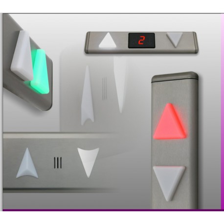 Structure: arrows bright polycarbonate opaque robust 35x48 mm or 67x67 mm (Standard ADA). Mounting: Front mounted on the plates of thickness between 1 and 3 mm. The protective cover of the electronic circuit is clipped on to the structure. Wiring: screw terminals or prewired (Pitagora System). Lighting: LED (red, green and white) 12/24V DC. Option: Gong 2 tone (up/down) with volume adjustable;. Interface card for connection to encoder Deum/Wardrobe Playboard. Former reference: FL-Frecce-CFM